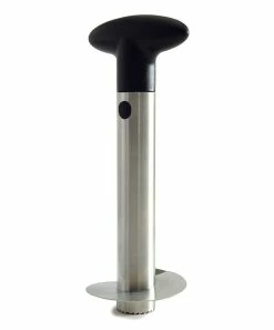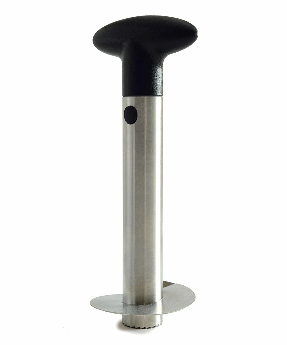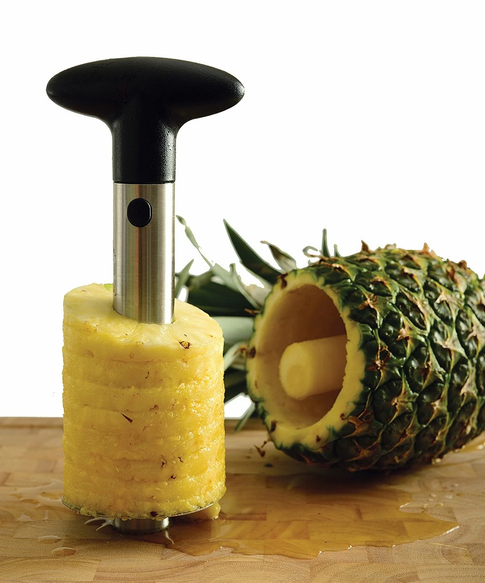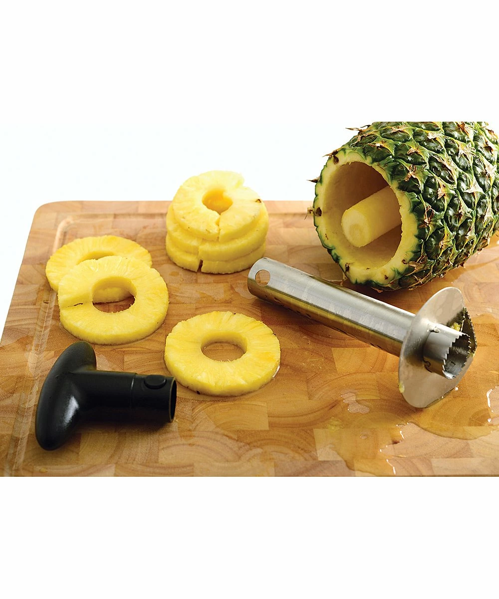 Featuring a comfortable handle and stainless steel construction, this convenient tool effortlessly cores and slices a whole pineapple.