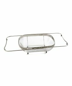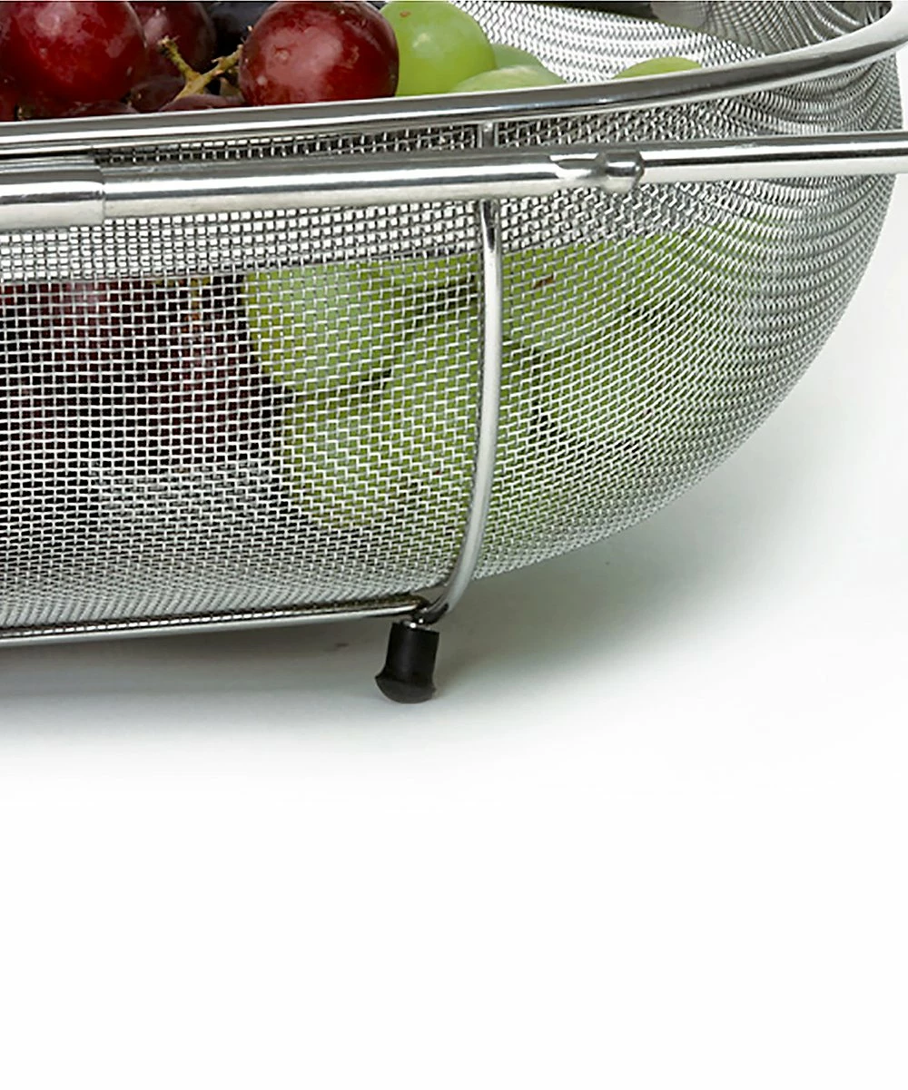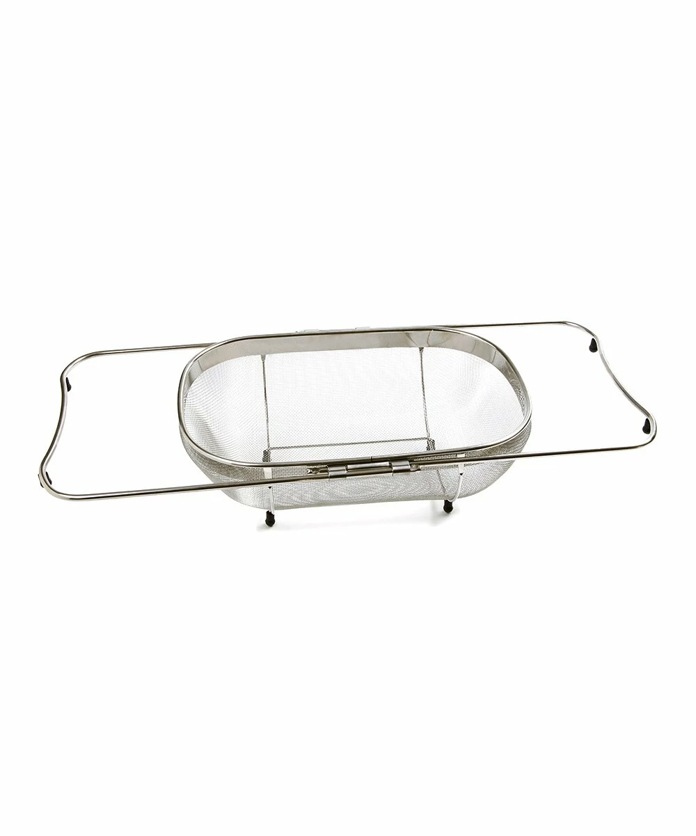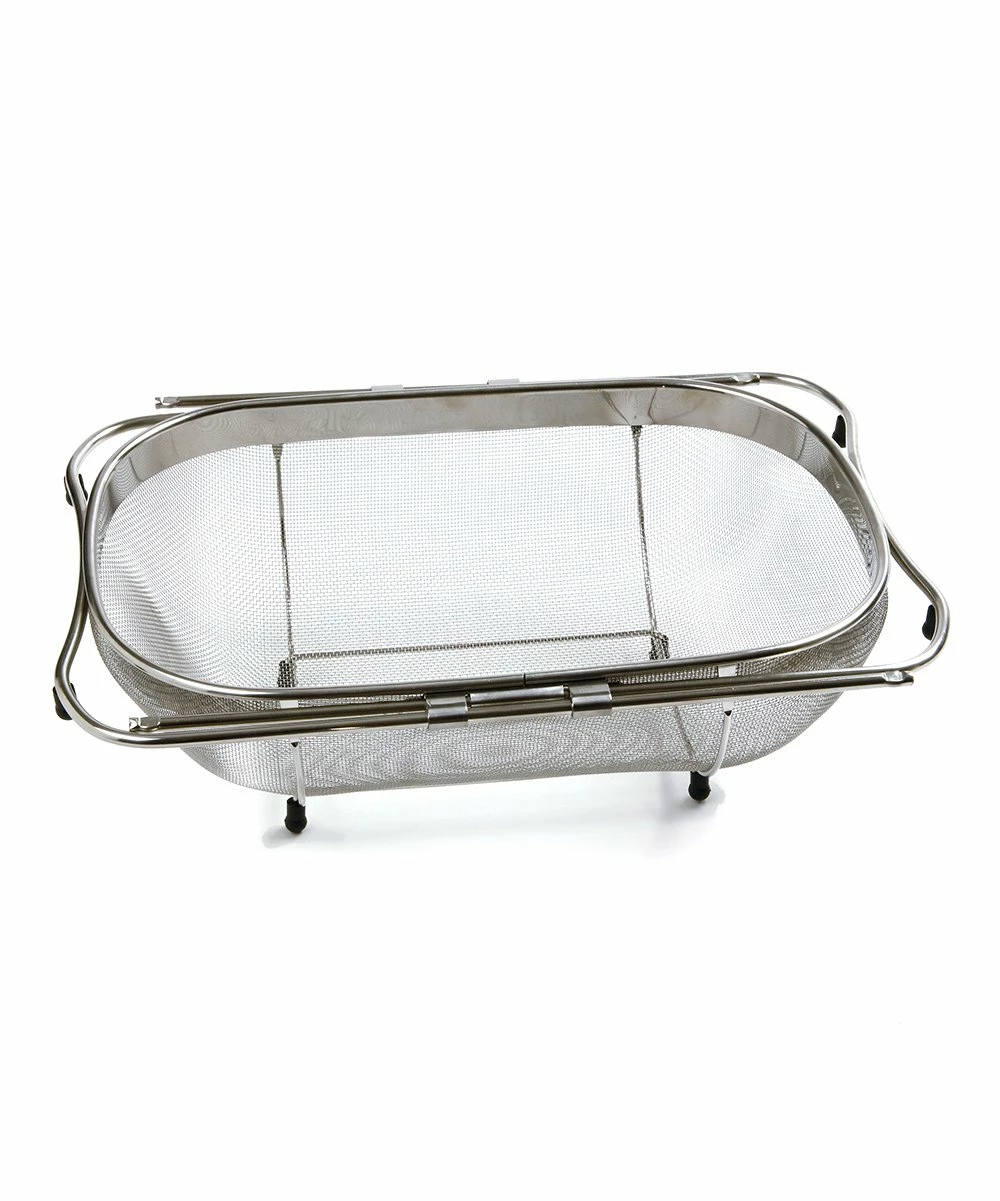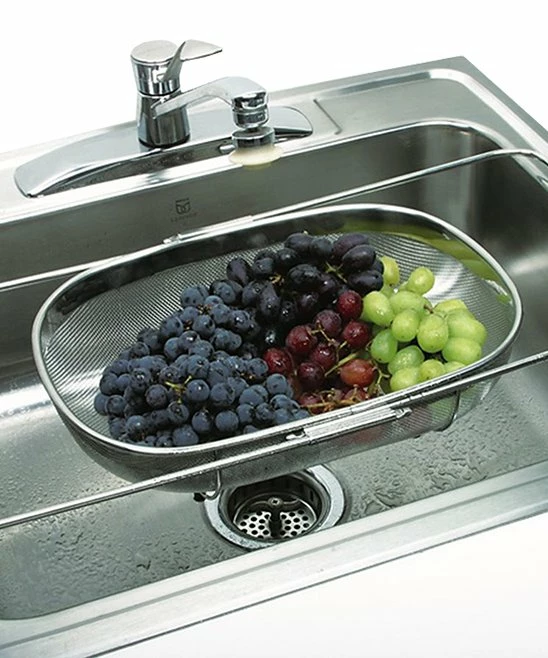 Free up hands by letting pasta, fruit and vegetables drain while preparing the rest of the meal. This colander hooks over the sink to save valuable counter space and keeps dripping water right where it belongs. The rubber feet keep the basket in place and protect sinks from metal handles.