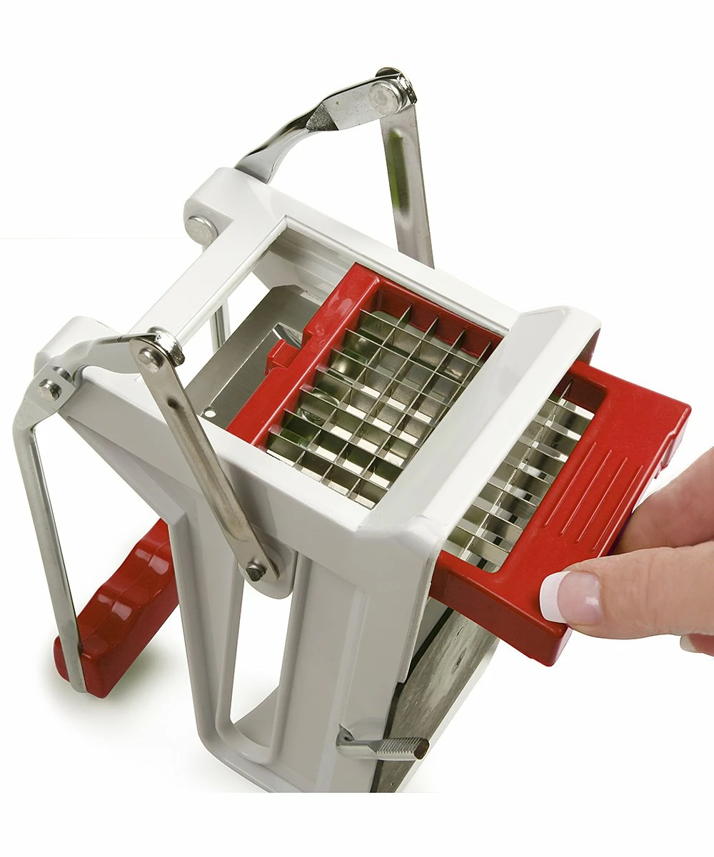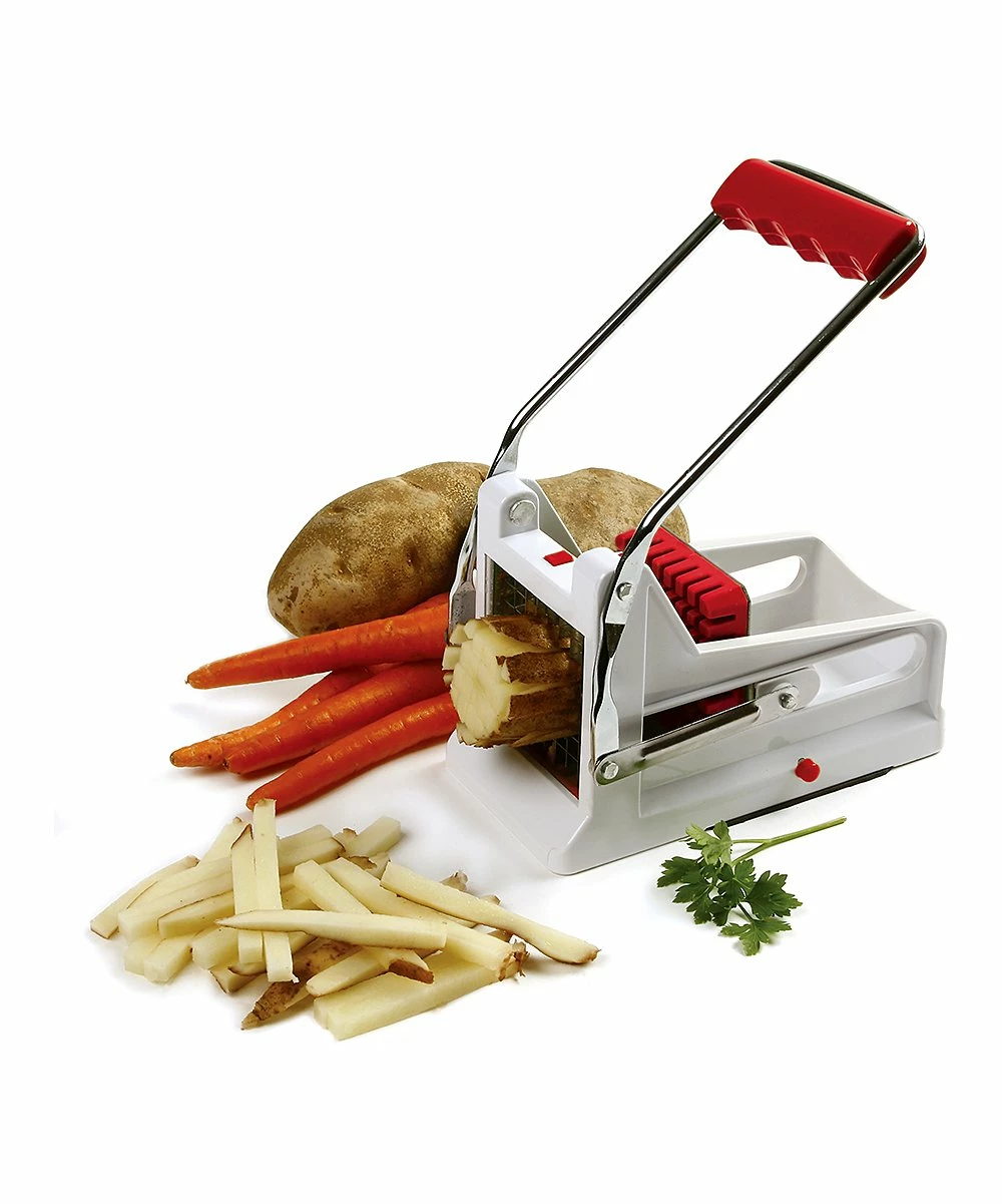 Cut and slice potatoes into uniform strips for baking or frying to create delicious french fries just like the kind found in restaurants. This handy tool boasts two cutting sections, and two pusher plates that can be used with a variety of vegetables.