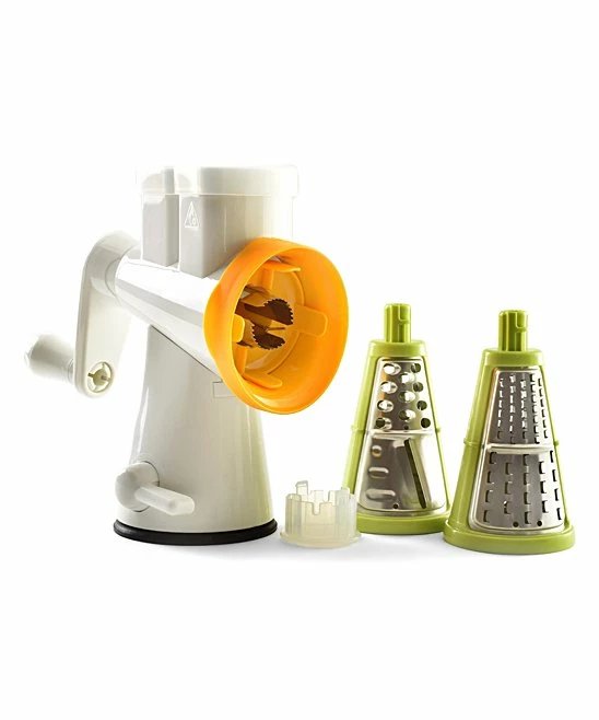 - Includes one rotary grater housing; one slicing blade drum; one fine grating blade drum; one coarse grating blade drum; one corn-off-the-cob slicing attachment.