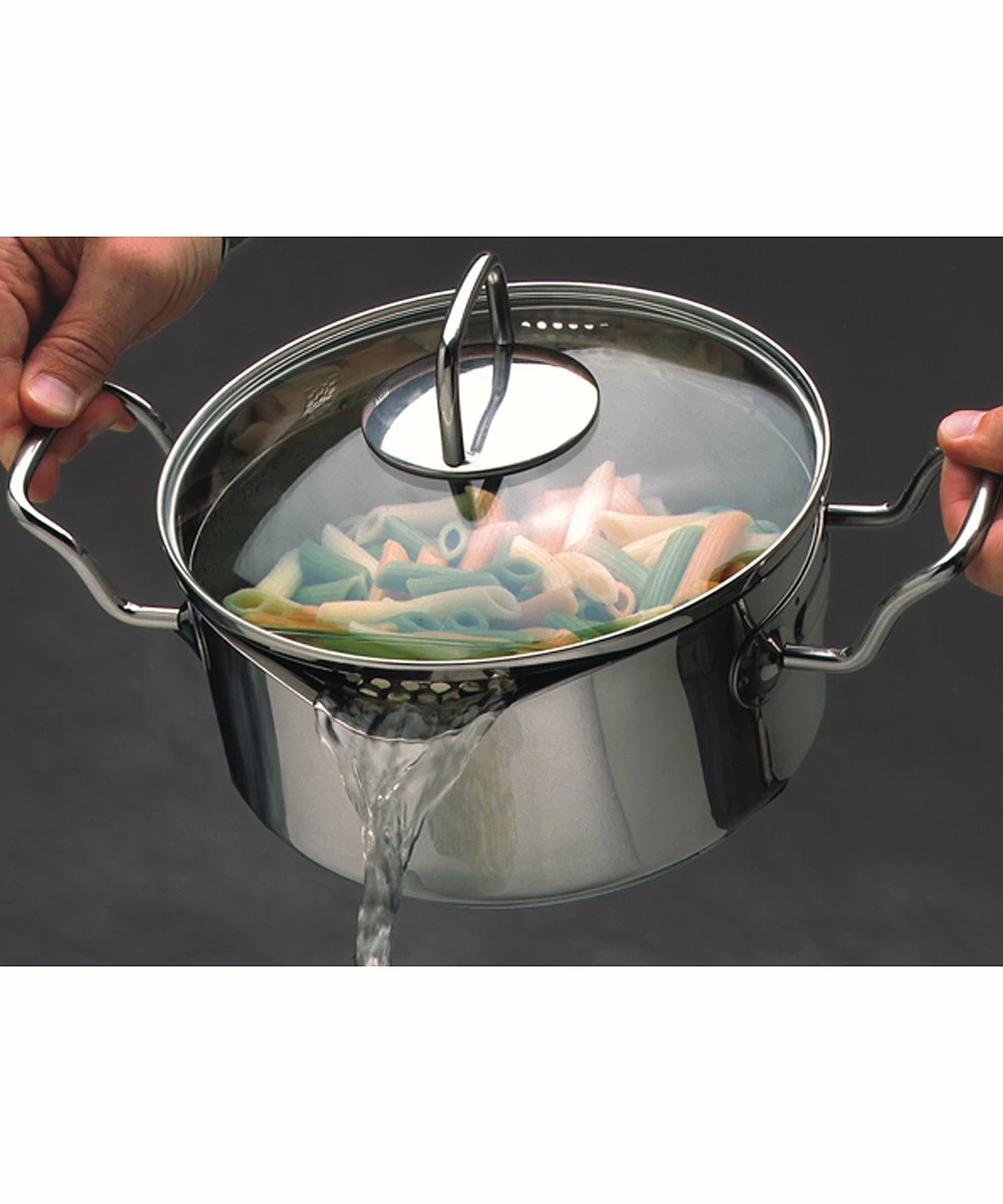 Ideal for cooking vegetables, potatoes and pasta, this pot has specially designed pour spouts to drain liquid with ease. The tri-ply encapsulated base incorporates two layers of stainless steel with an aluminum core layer in the middle, ensuring increased heat conductivity, even heat distribution, increased cooking efficiency and protection from hot spots. The glass lid guarantees food visibility, while the stay-cool handle is designed for comfort and safety.