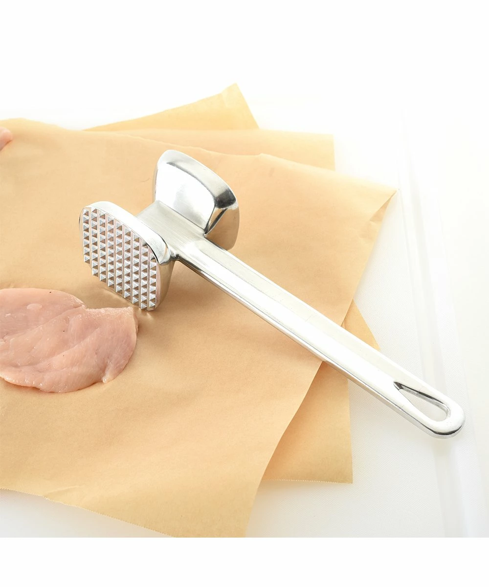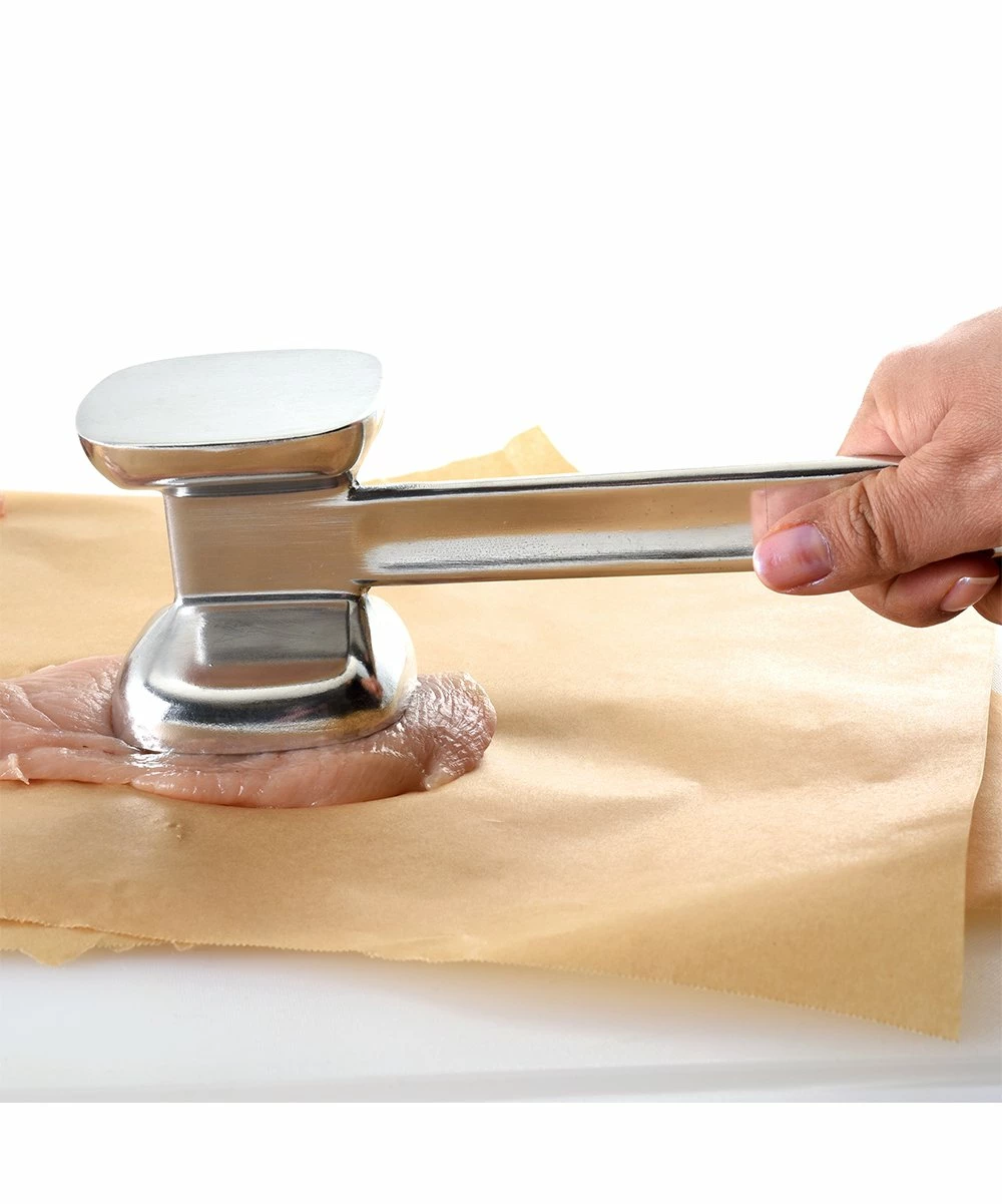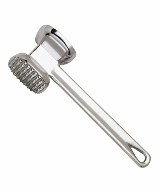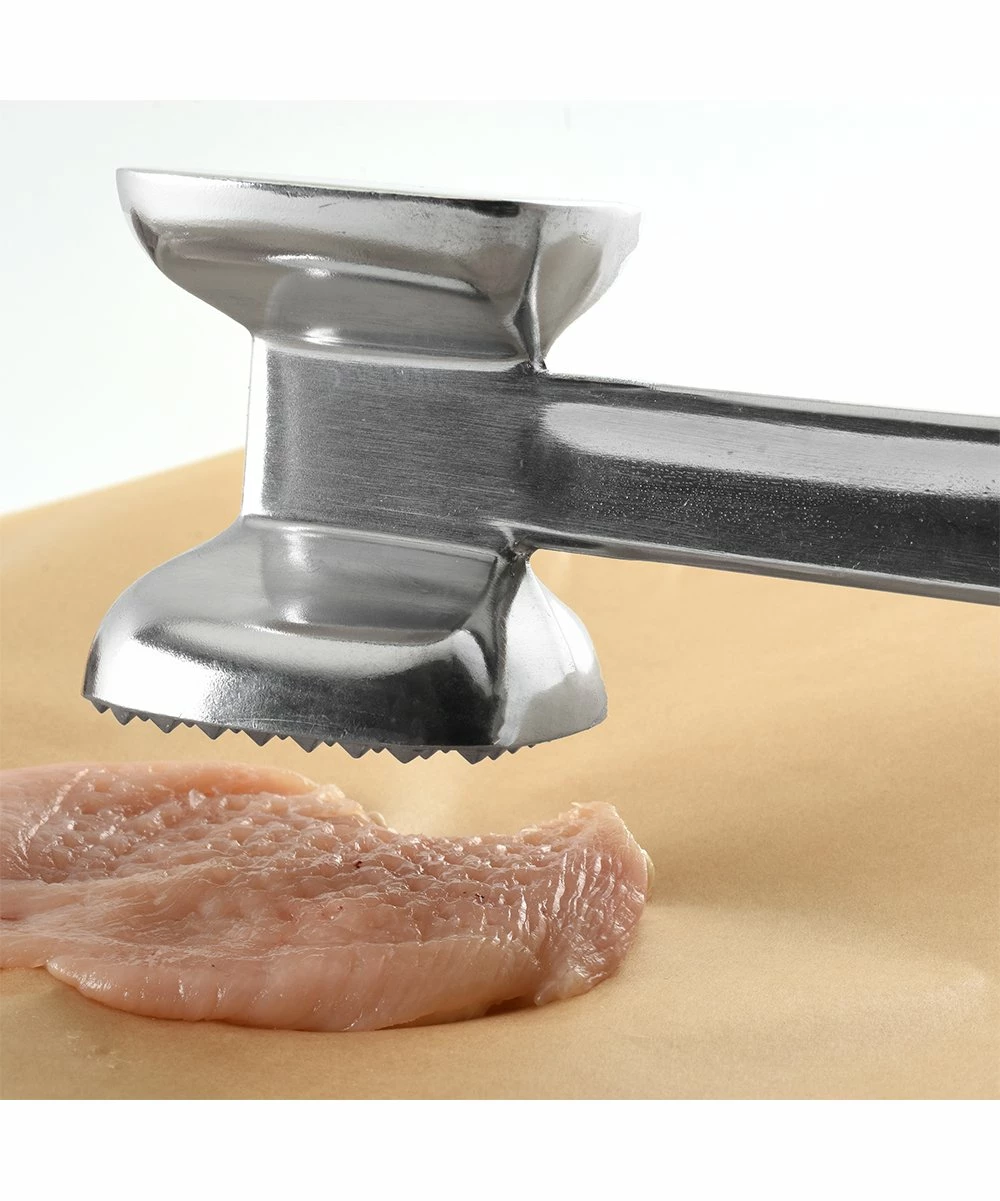 This handy tool features a spiked surface for meat tenderizing and a flat side for pounding cuts into uniform thickness for even heat distribution.