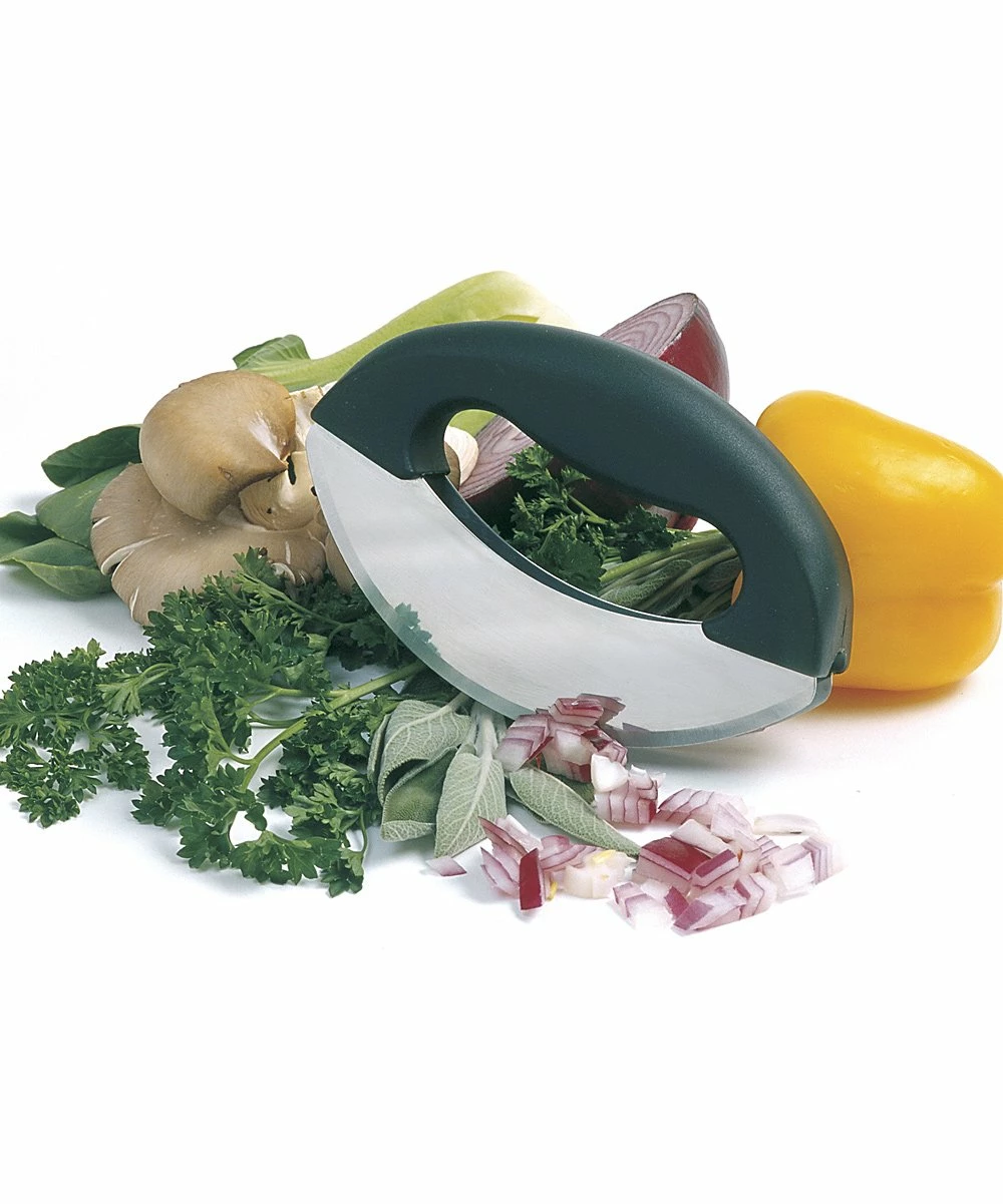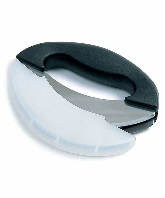 This heavy-duty mezzaluna chopper boasts stainless steel double blades with beveled edges and has a comfortable grip for cooking ease. A blade cover provides protection and safety when stored.