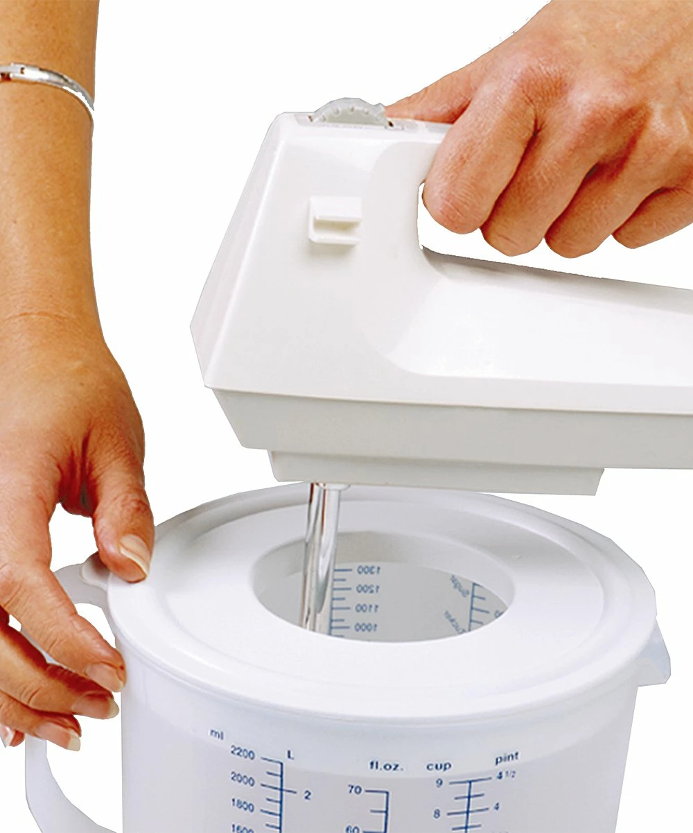 Featuring clear measurements on the side and a coordinating lid, this mixing cup prevents batter and other liquid contents from splattering, has a large capacity and is dishwasher safe for easy cleaning. It measures in cups, pints, ounces, liters and milliliters.