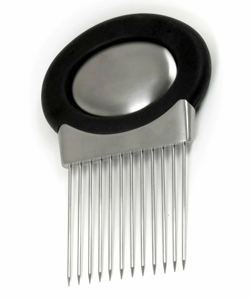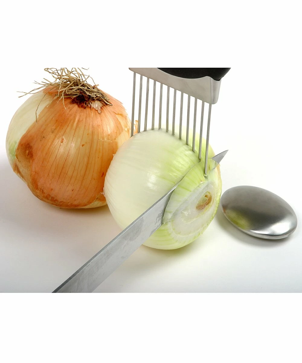 Stock the kitchen with innovative essentials to ensure that cooking is as convenient as possible. The stainless steel tines of this onion holder help to hold the onion steady while guiding the knife for even slices. This holder even includes an attached stainless steel oval that removes onion odor from hands.