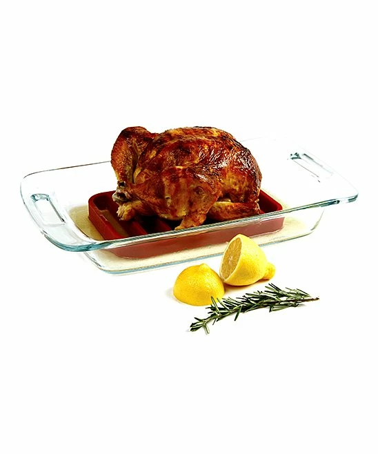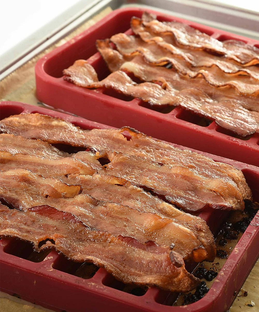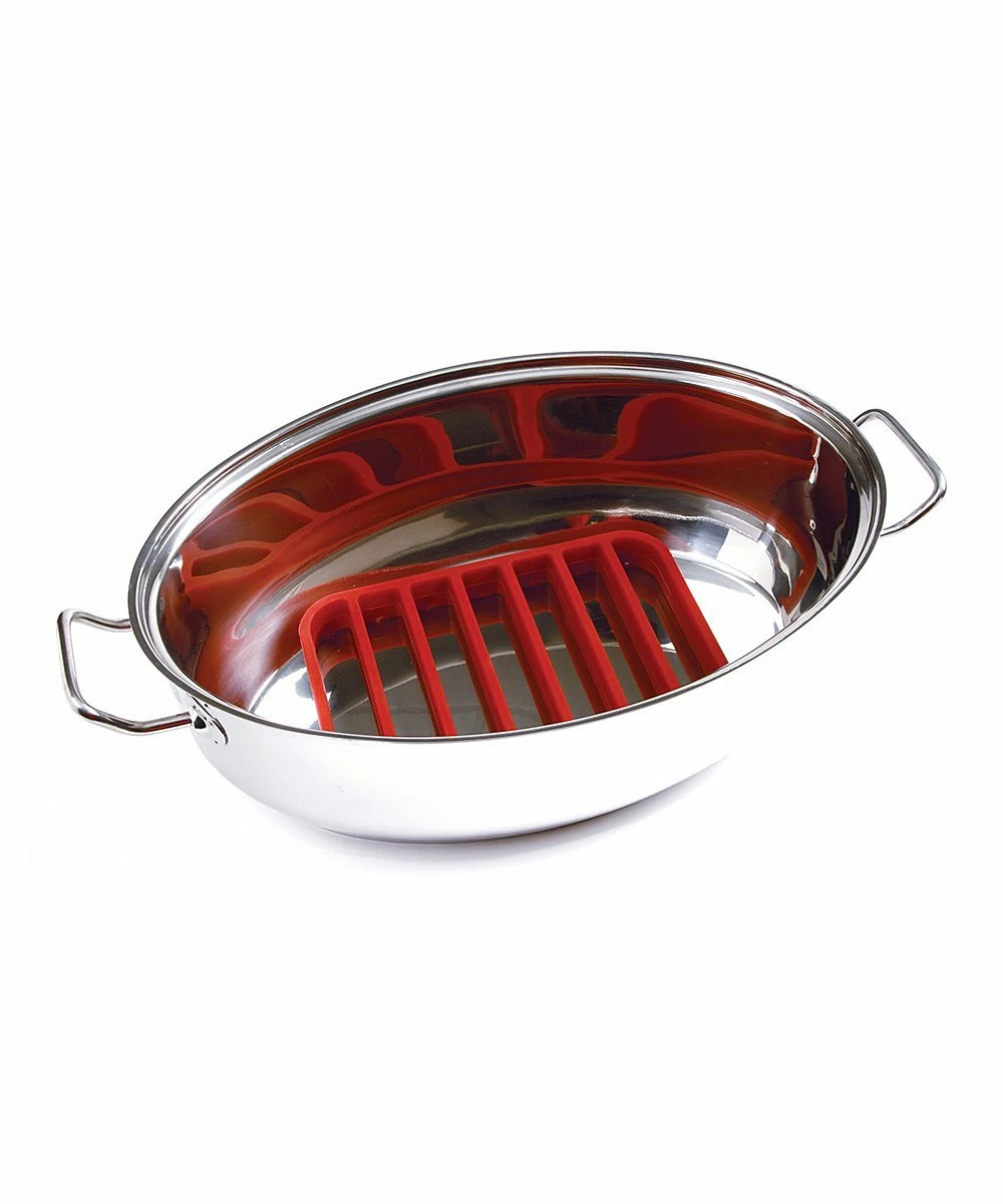 Cook meat, fish and veggies faster and healthier with this silicone roasting rack. It promotes even browning and heating while preventing food from burning and sticking to the pan.