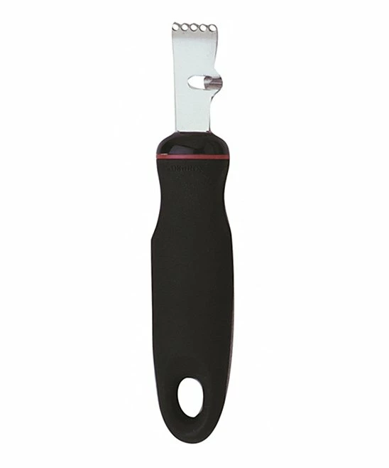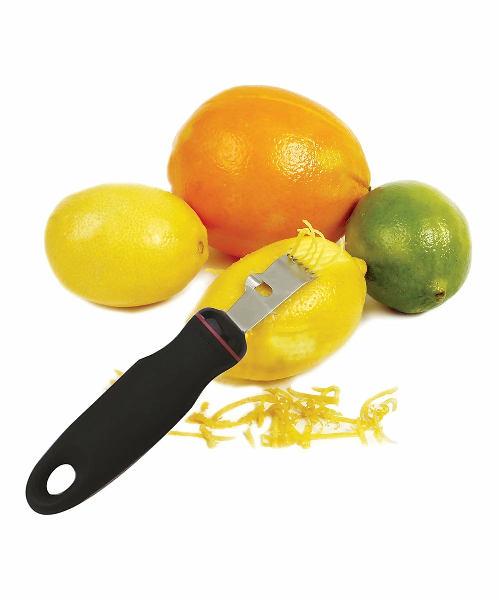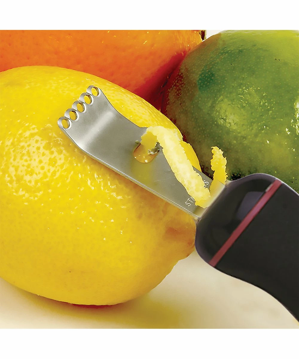 Zest up a lemon for a tart or peel a delicate ribbon for a cocktail with this zester and stripper tool. Its soft nonslip grip keeps it securely in hand, while the stainless steel tip cuts through rinds.